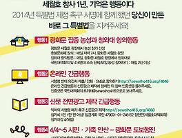 | [함께해요] 세월호 특별법 무력화 시행령 폐기 & 인양 촉구 416시간 시민 긴급행동 (+ 수원지역 일정 안내) (1) | 2015.04.01 |