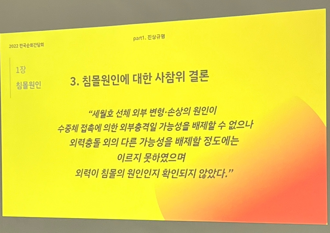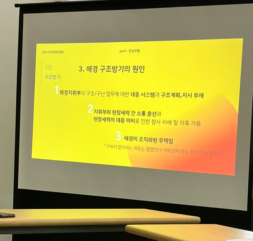 사참위 활동 보고와 창현어머니,주현어머니와 함께 한 질의응답 시간에 세월호 참사의 밝혀지지 않은 원인과 진상규명이 이태원 참사를 번복했다는 생각을 지울 수 없었습니다. 거대한 참상을 겪고도 국민의 안전을 인식하지 못한 정부의 무책임이 다시한번 드러났다고 해도 과언이 아닙니다.