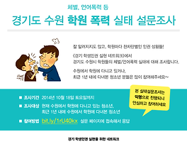 | 수원 학원폭력 실태 설문조사 - 청소년 여러분의 참여 바랍니다! (0) | 2014.10.06 |