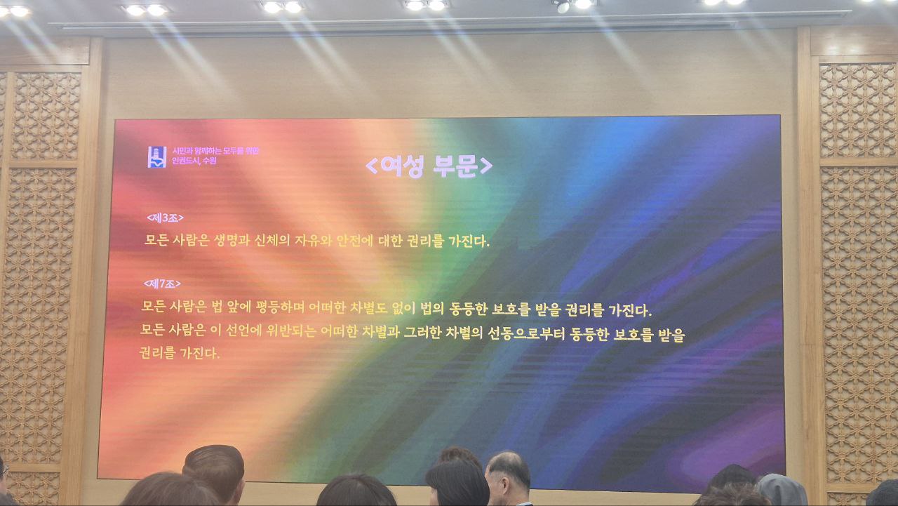 수원시에서는 세계인권선언의 날 77주년을 맞아 기념식이 있었습니다. 식전공연으로 팔달여성합창단의 공연이 있었고 인권작품 공모전 시상식, 기념사, 세계인권선언문 퍼포먼스, 수원이주민센터 베트남전통춤 공연으로 끝이 났습니다. 인권작품 공모전 시상은 다양한 정체성을 가진 사람들이 받았습니다. 가장 인상 깊었던 것은 세계인권선언문을 아동, 이주민, 여성, 노인부문으로 나누어 각 부분의 당사자들이 일어나서 읽었던 퍼포먼스였습니다. 장애인이 빠졌고 이주민이 자신의 제1언어로 읽지 않은 게 조금 아쉬웠지만, 사회적 약자인 사람들의 목소리로 세계인권선언문을 읽었다는 것은 의미 있었습니다.