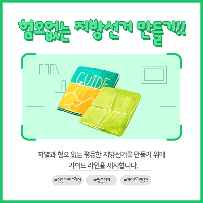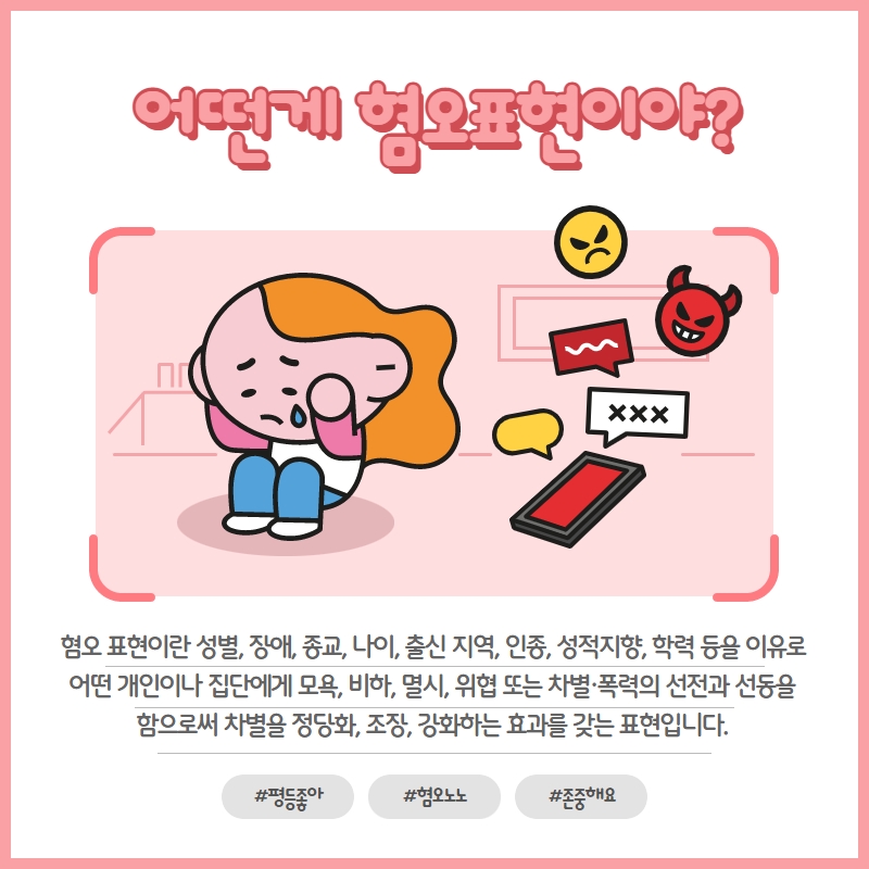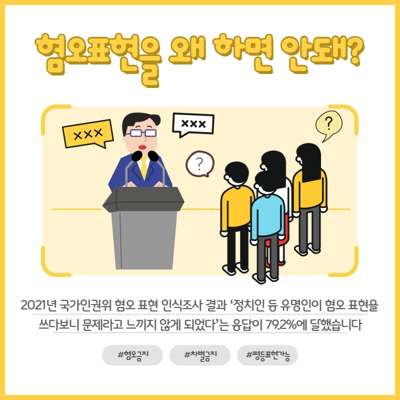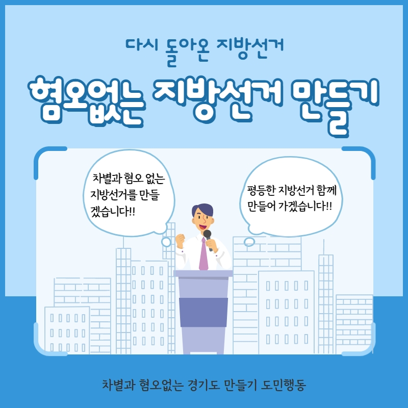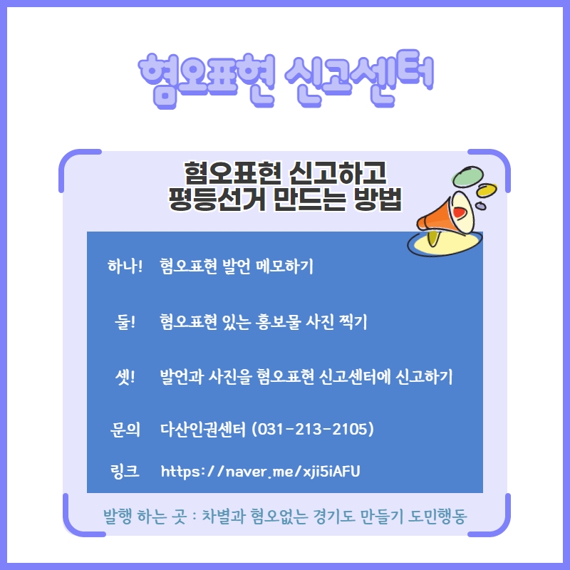 알림 : 공지사항 [참여요청] 차별과 혐오 없는 평등한 지방선거 만들기 위해 함께해요! 인권교육온다 2022. 5. 17. 13:39 혐오표현이 용인되는 상황을 막고 평등한 지방선거를 만들기 위해 <혐오표현 신고센터>를 운영하려고 합니다. https://naver.me/xji5iAFU